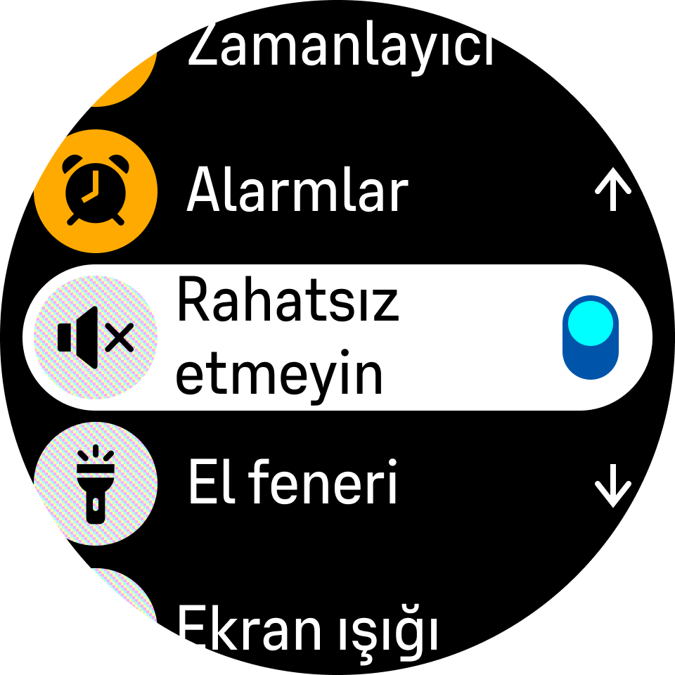 Rahatsız Etmeyin modu, tüm sesleri ve titreşimleri kapatıp ekranı karartan bir ayardır. Saatin her zamanki gibi ama sessiz bir şekilde çalışmasını istediğiniz tiyatro gibi ortamlarda saati kullanırken çok faydalı bir seçenektir.