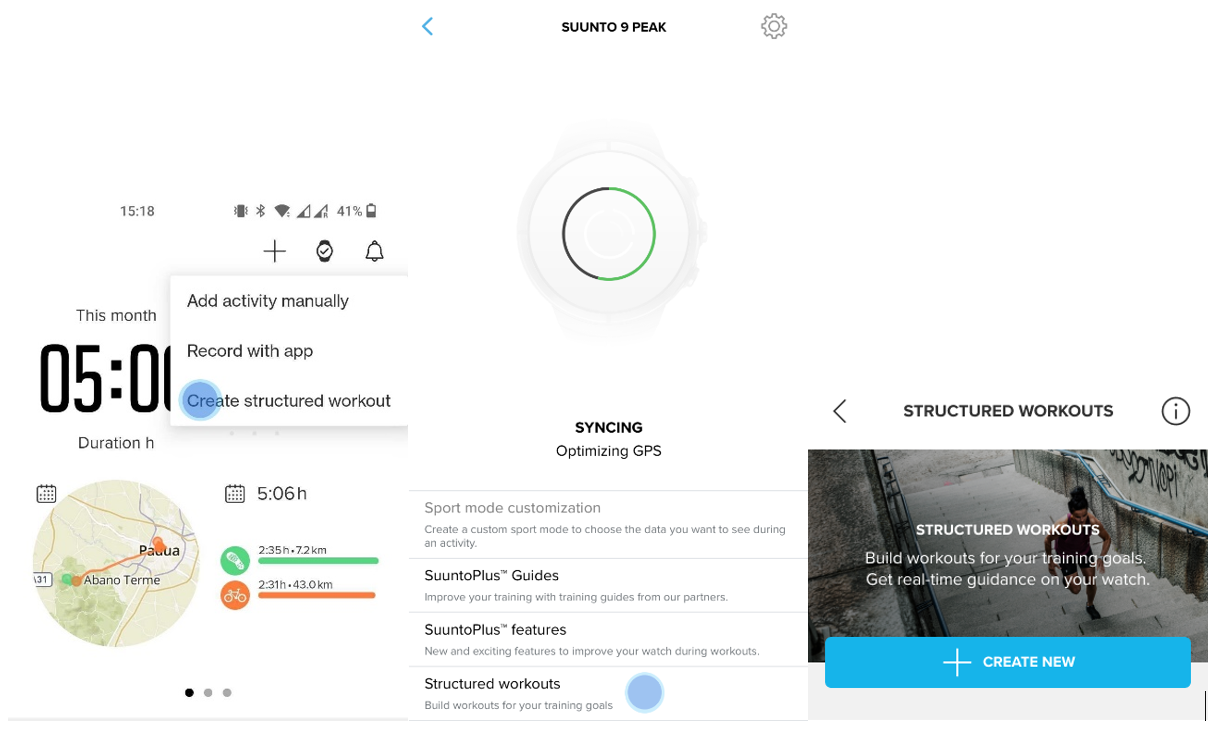 To create a structured workout in Suunto app that you can use in your watch to guide you during a training session, you can either tap on the “+” symbol on the top right and select “create structured workout”, or tap to the watch symbol and, from the main watch syncing display, tap on “structured workouts” and then “create new”