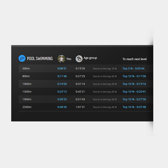 Compare your annual and all-time personal bests with those of your peer group to see how good you are. For example, you can compare your open water swimming 1900 m personal best to see if you rank in the top 20% of your peer group, and how much faster you need to be to reach the top 10%. This gives you also unique insight if you are suited for long distances or better equipped for short intensive races.