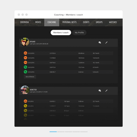 Connect with your coach on Suunto Movescount and your coach will be able to track your training load, rest & recovery and follow your progress, give you feedback on specific training sessions and plan your workouts for the upcoming weeks. A new message service in Suunto Movescount allows direct messaging between you and your trainer. If you have signed up as a coach, the members you follow are listed in your profile and you can monitor how they train in one, simple view. Suunto Movescount also allows you to make notes about each of your athletes, to stay up to date on their training.