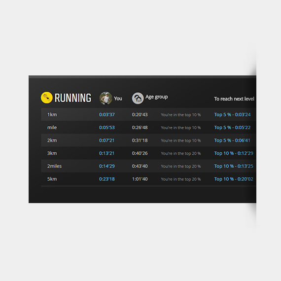 Easily compare your personal bests with those of your age group (e.g. men 35-40, women 20-25) to find out how well you rank. Do you belong in the fastest 20 % on a 5 km run? How much faster would you need to be to land in the fastest 10 %?