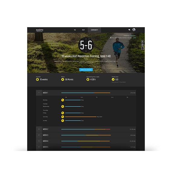 Suunto Movescount offers thousands of ready-made training programs to choose from. Select the training program that matches your goal, edit the details if necessary and save it to your calendar to start training. You can also create your own long term training plan and share it for other Movescount members to use.