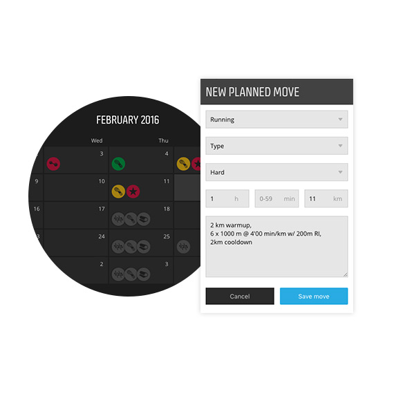 Suunto Movescount offers an easy way to plan upcoming training sessions. Define the activity, intensity, duration and/or distance and save the Move to your training calendar. The saved exercises are automatically transferred to your compatible Suunto sports watch when you sync it with Suunto Movescount.