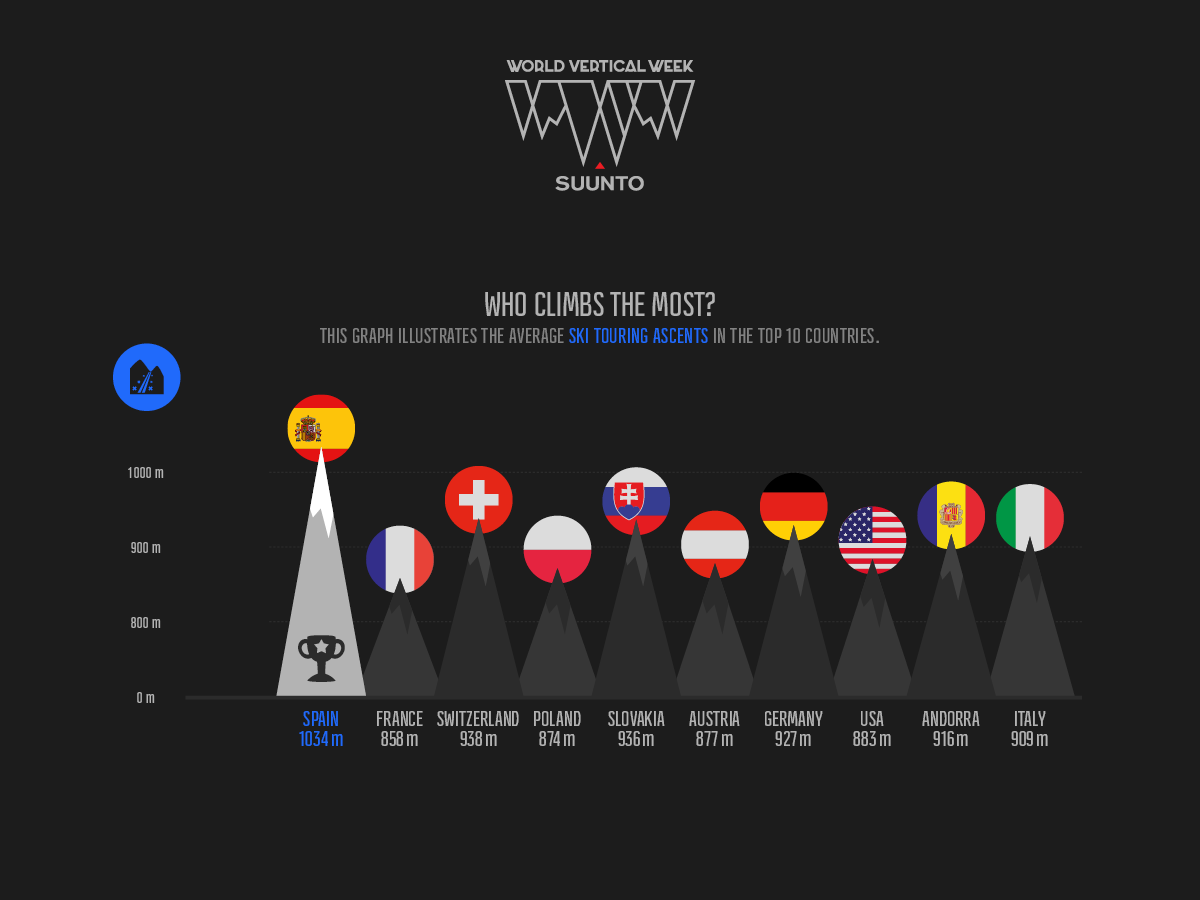 Now that we know that ski touring is the sport with the biggest average ascents, it is time to dig deeper. The snowy winter in the Pyrenees has boosted the skiing spirits of the Spanish and they were the only athletes to cross the thousand vertical meter mark – in any country and any activity. Felicitaciones, españoles!