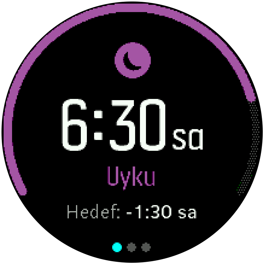Genel uyku eğiliminizi, uyku analizi ile takip edebilirsiniz. Saat yüzündeyken, Uyku süresi ekranını görene kadar sağ alt düğmeye basın. İlk görünüm, son uykunuzun uyku süresi hedefinizle kıyaslamasını gösterir.