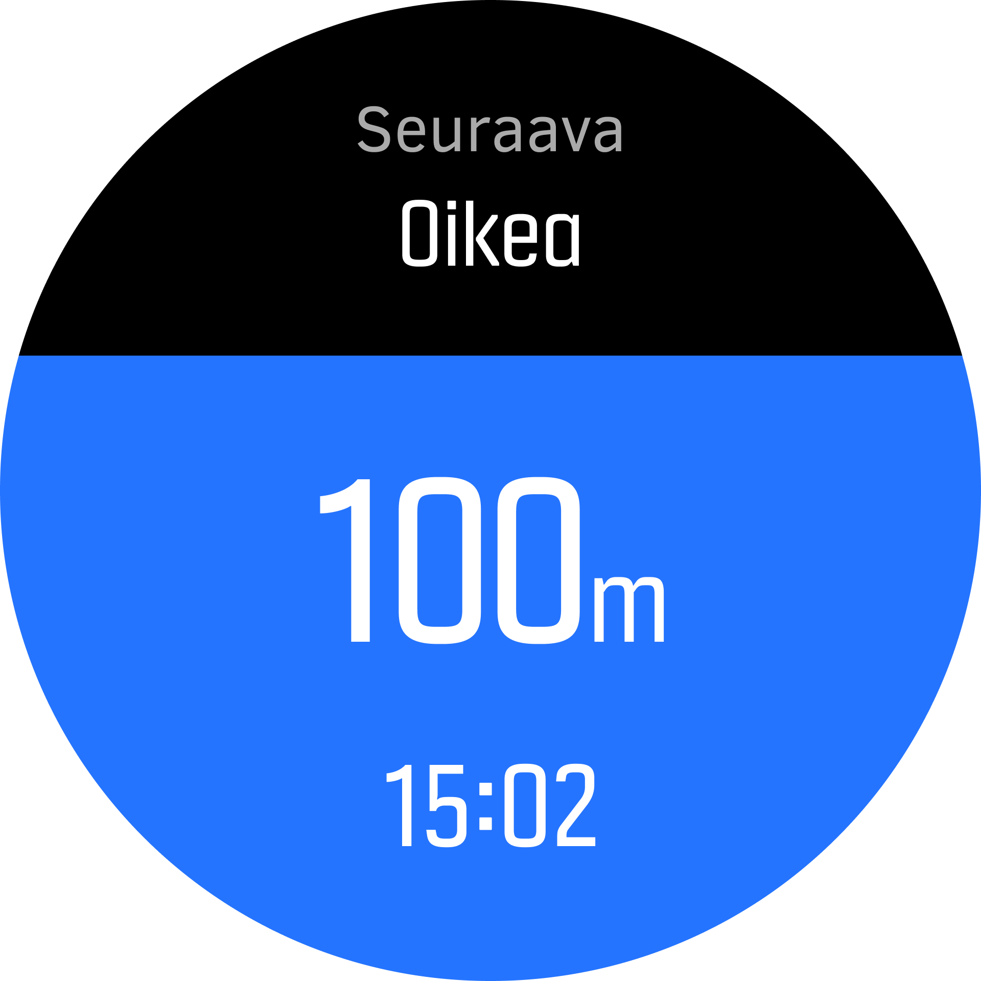 Luodessasi reittejä Suunto-sovelluksessa voit halutessasi ottaa käyttöön käännöksittäiset reittiohjeet. Kun siirrät reitin kelloosi ja käytät sitä navigointiin, se ohjaa sinua aina risteyksissä antamalla äänimerkkejä ja tietoja kääntymissuunnasta.