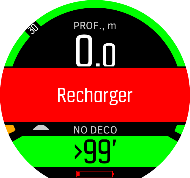 Lorsque le temps de batterie restant passe à deux heures et que vous êtes en surface, un message de notification rouge Recharger apparaît. Le message contextuel rouge reste affiché à l'écran au-dessus de tous les autres éléments et il vous est impossible de le faire disparaître tant que vous ne mettez pas l'appareil en charge ou tant que vous ne passez pas à la vue de l'heure. Lorsque le niveau de batterie passe en dessous de deux heures, il est impossible d'entamer une plongée avec le Suunto D5. Pour la plongée en apnée, la limite est de 30 minutes.