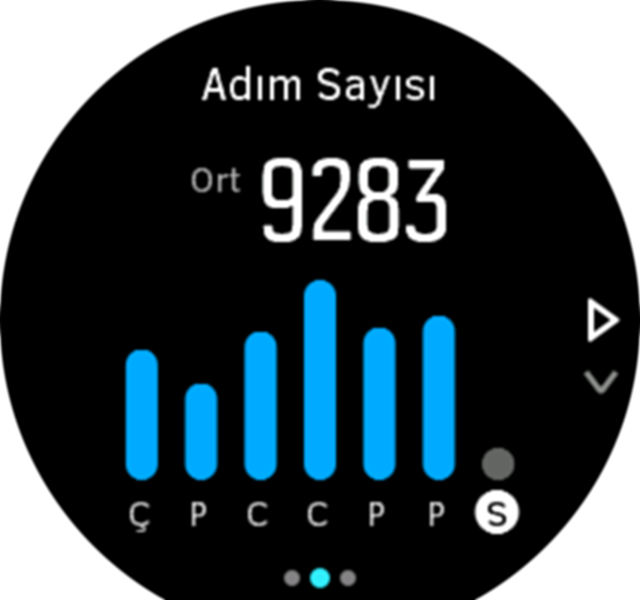 Ayrıca, ekranı sola doğru kaydırarak son yedi gün içindeki adım sayınızı da kontrol edebilirsiniz. Kalori tüketimini görmek için, ekranı sola kaydırın veya orta düğmeye tekrar basın.